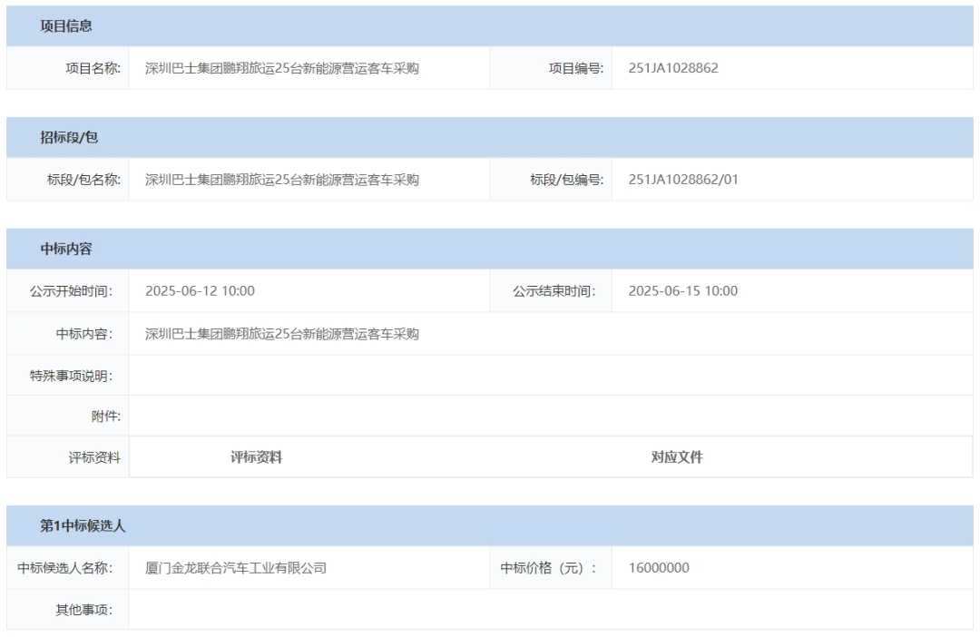其中,深圳巴士集团鹏翔旅运25台新能源营运客车采购候选人公示显示,厦门金龙联合汽车工业有限公司为中标候选人,中标价格为1600万元。
